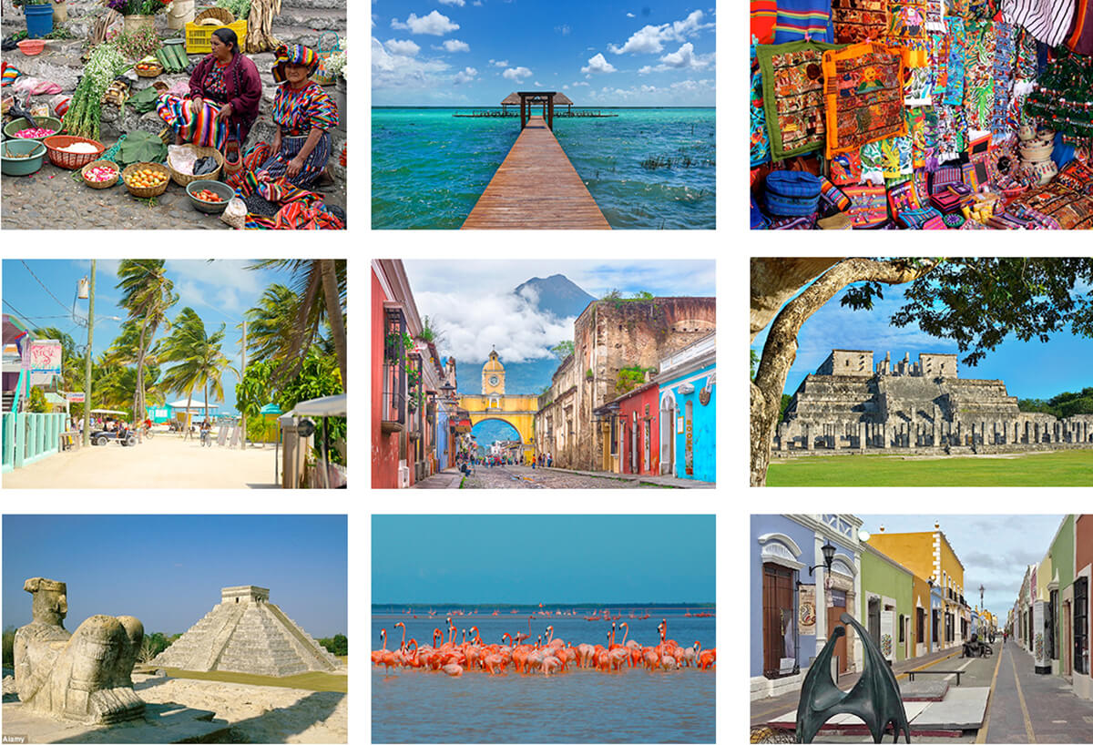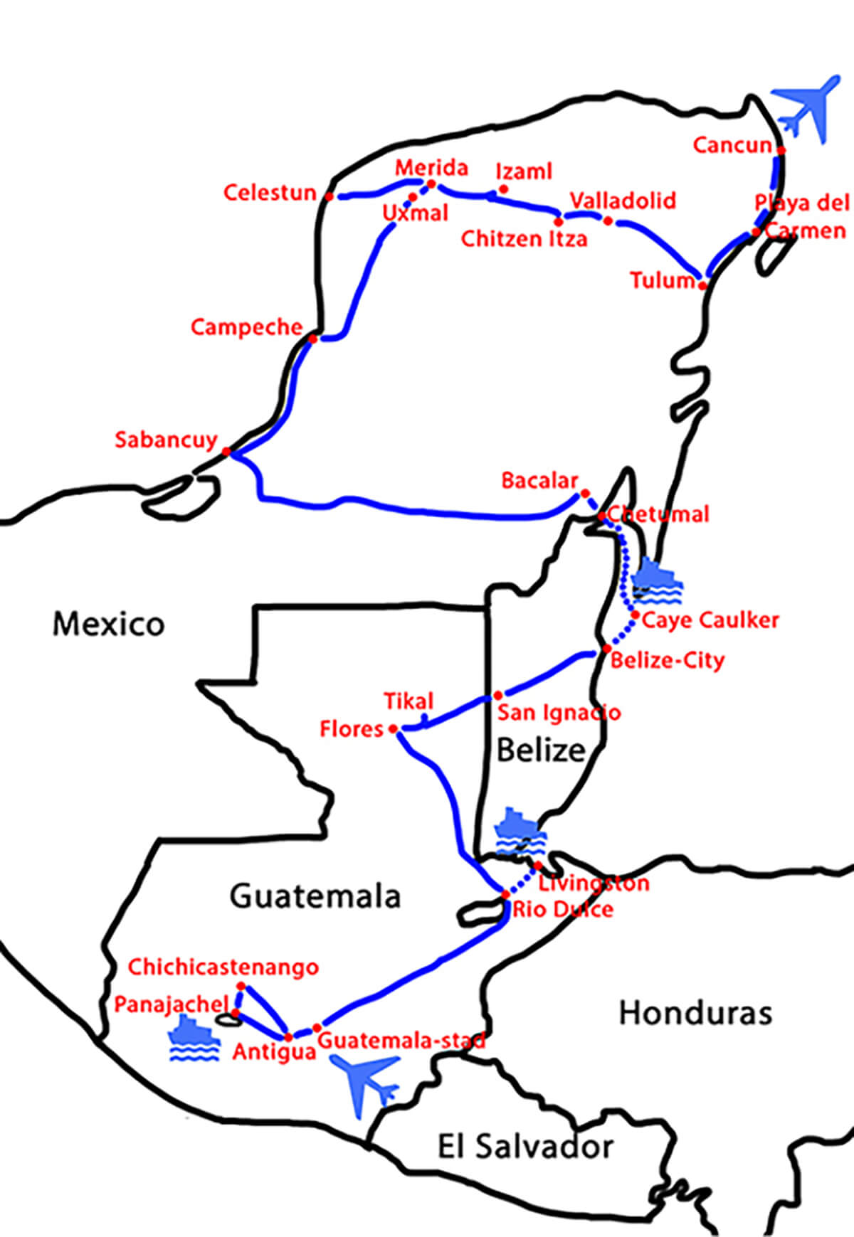 We beginnen de reis in de zeldzaam mooie koloniale stad Antigua Guatemala, met kleurrijke straatjes vol oude kerken en koloniale huizen. Vanaf Antigua gaat het verder naar Panajachel aan het meer van Atitlán. In een dag vaar je over het Atitlánmeer langs verschillende inheemse dorpjes. Op zondag zijn we in Chichicastenago, de dag dat de inheemse bevolking uit de hele omgeving naar de markt komt. Dit is ook een goede plek om souvenirs in te kopen. Vanuit Chichicastenango gaan we door het binnenland naar Copan. Na een bezoek aan de kleine groene meertje van Semuk Champey, vervolg je de reis naar Rio Dulce in een prachtige waterrijke omgeving. Per boot gaat het over de Rio Dulce, de zoete rivier, naar het Caribische Livingston. De indrukwekkende Mayaruïnes van Tikal staan op het programma voor de reis over de grens naar Belize gaat. Na een nacht in San Ignacio, gaat het via Belize City naar het eiland Caye Caulker. Het is heerlijk relaxen op dit Caribische eiland. Vanaf Caye Caulker, gaat het per watertaxi naar Mexico. Hier wacht het prachtige helderblauwe meer van Bacalar. De volgende highlight op het programma is het koloniale sprookjescentrum van de stad Campeche, die op de werelderfgoedlijst staat. De fantastische Mayaruïnes van Uxmal zijn niet ver van de mooie stad Merida. Via het gele klooster van Izamal, gaan het richting de overblijfselen van de fascinerende Mayastad Chichén Itzá. Na een bezoek aan een prachtige Cenote en de stad Valladolid zijn de Mayaruïnes van Tulum de afsluiter van deze Mayaroute door Guatemala, Belize en Mexico. Na alle indrukken is het mogelijk om nog een paar dagen uit te rusten op het strand van Playa del Carmen of Cancun. De vlucht terug vertrekt vanaf Cancun.